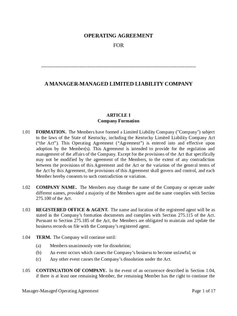 OPERATING AGREEMENT FOR ___ A MANAGERMANAGED LIMITED LIABILITY COMPANYARTICLE I Company Formation 1.01FORMATION. The Members have formed a Limited Liability Company (\” Company\”) subject to the