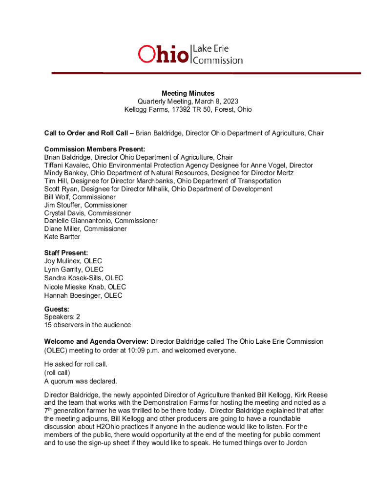 Meeting Minutes Quarterly Meeting, March 8, 2023, Kellogg Farms, 17392 TR 50, Forest, Ohio Call to Order and Roll Call Brian Bald ridge, Director Ohio Department of Agriculture, Chair Commission Members