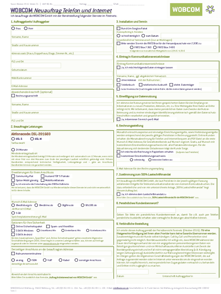 Stand: October 2016 Intern C1 | AUF DNR.: ___ ___ Vert rag: ___ ___ Fall: ___ ___WEBCAM Neuauftrag Telephone UND Internet beauftrage die WEBCAM GmbH MIT her Bereitstellung fol gender Denote I'm Fastness.