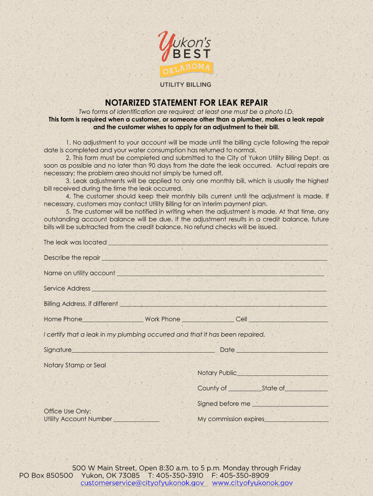 Get the free NOTARIZED STATEMENT FOR LEAK REPAIR - cityofyukonok