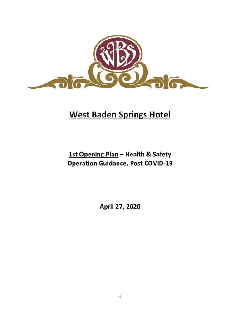 West Baden Springs Hotel1st Opening Plan Health & Safety Operation Guidance, Post COVID19April 27, 20201CONTENTSCOVER.1 TABLE OF CONTENTS.2 PURPOSE/GENERAL ..........................