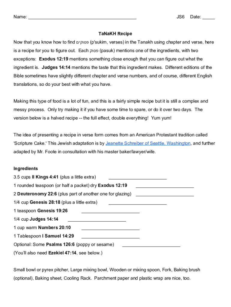 Name: ___JS6Date: ___Tanaka Recipe Now that you know how to find (p\'skim, verses) in the Tanaka using chapter and verse, here is a recipe for you to figure out. Each (park) mentions one of the ingredients,