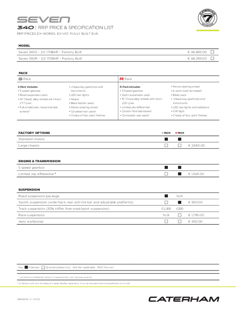 SEVEN340 | RAP PRICE & SPECIFICATION LIST RAP PRICES WORKS, EXPAT, FULLY BUILT EU6MODEL Seven 340S 2.0 170BHP Factory Built 46,895.00Seven 340R 2.0 170BHP Factory Built 48,295.00PACK Pack S Pack includes:Pack
