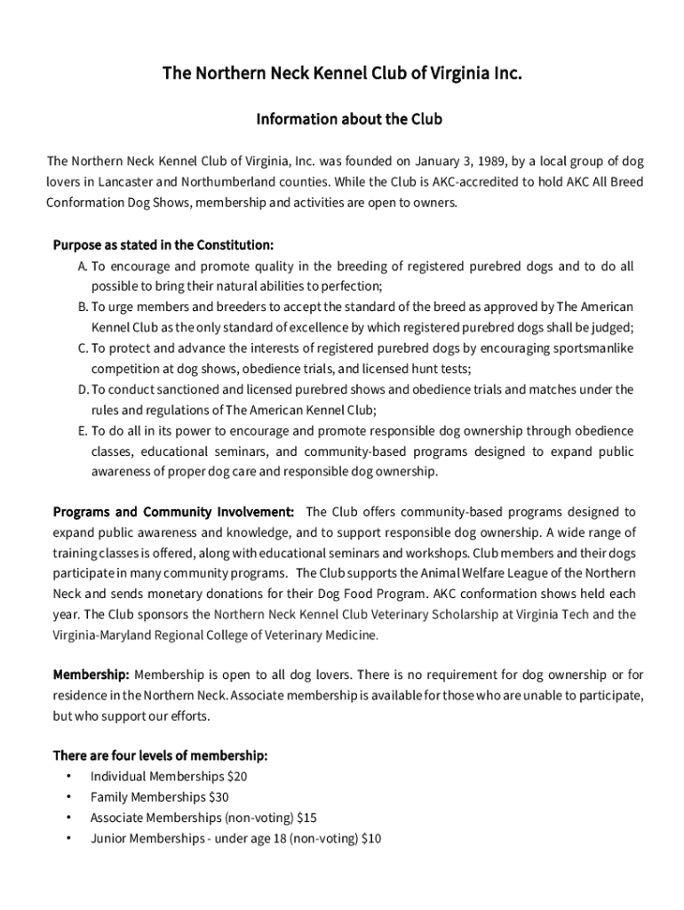The Northern Neck Kennel Club of Virginia Inc. Information about the Club The Northern Neck Kennel Club of Virginia, Inc. was founded on January 3, 1989, by a local group of dog lovers in Lancaster