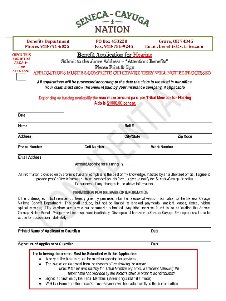 Benefits Department Phone: 9187916025 CHECK THIS BOX IF YOU ARE A 1st TIME APPLICANT PO Box 453220 Fax: 9187869245Grove, OK 74345 Email: benefits@sctribe.comBenefit Application for Hearing Submit
