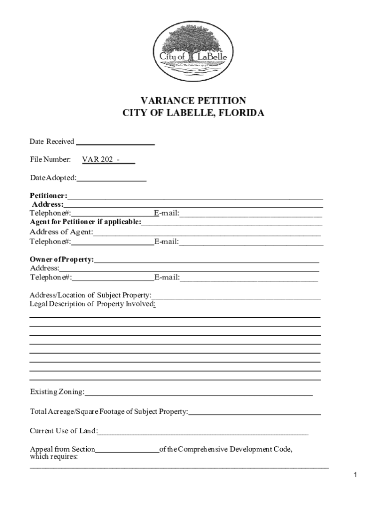 VARIANCE PETITION CITY OF LaBelle, FLORIDA Date Received File Number:VAR 202 ___Date Adopted: Petitioner:___ Address: Telephone#: Email:___ Agent for Petitioner if applicable:___ Address of Agent:___