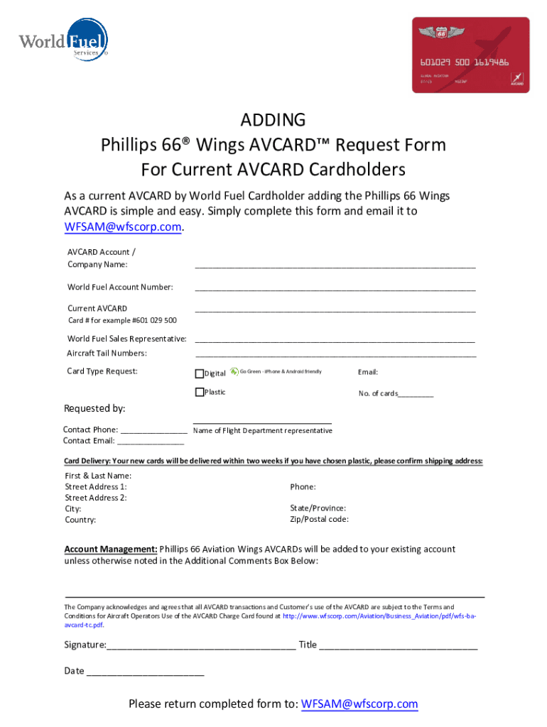 ADDING Phillips 66 Wings AVC ARD Request Form For Current AVC ARD Cardholders As a current AVC ARD by World Fuel Cardholder adding the Phillips 66 Wings AVC ARD is simple and easy. Simply complete