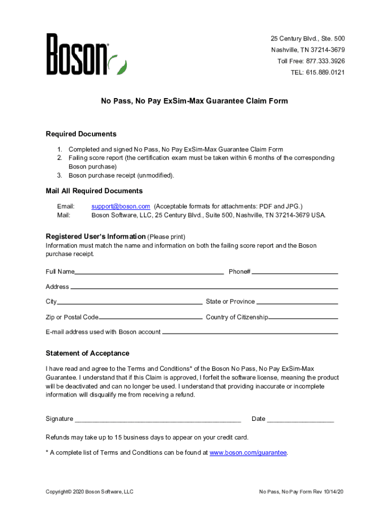 Get the free No Pass, No Pay ExSim-Max Guarantee Claim Form