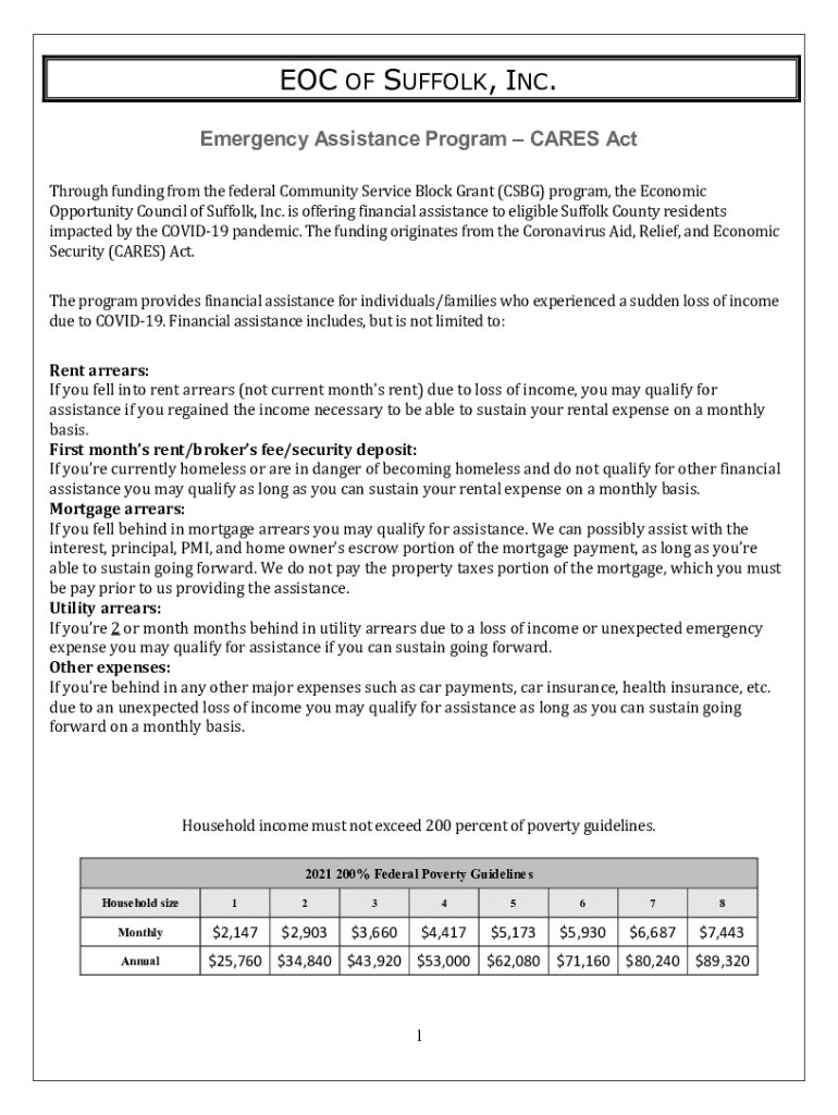 EOC OF SUFFOLK, INC. Emergency Assistance Program CARES Act Through funding from the federal Community Service Block Grant (CSG) program, the Economic Opportunity Council of Suffolk, Inc. is offering