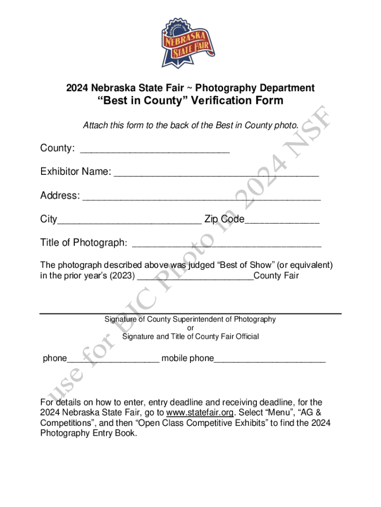 2024 Nebraska State Fair Photography Department Best in County Verification Form Attaches this form to the back of the Best in County photo. County: ___ Exhibitor Name: ___ Address: ___ City___ Zip