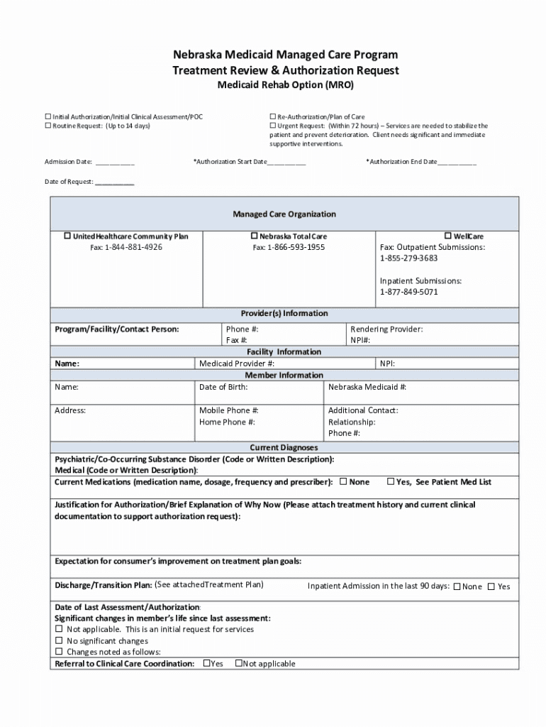Nebraska Medicaid Managed Care Program Treatment Review & Authorization Request Medicaid Rehab Option (MRO) Initial Authorization/Initial Clinical Assessment/POC Routine Request: (Up to 14 days)Admission