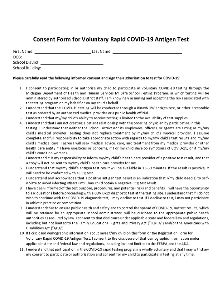 Consent Form for Voluntary Rapid COVID-19 Antigen Test First Name: ___ Last Name: ___ DOB: ___ School District: ___ School Building: ___ Please carefully read the following informed consent and sign
