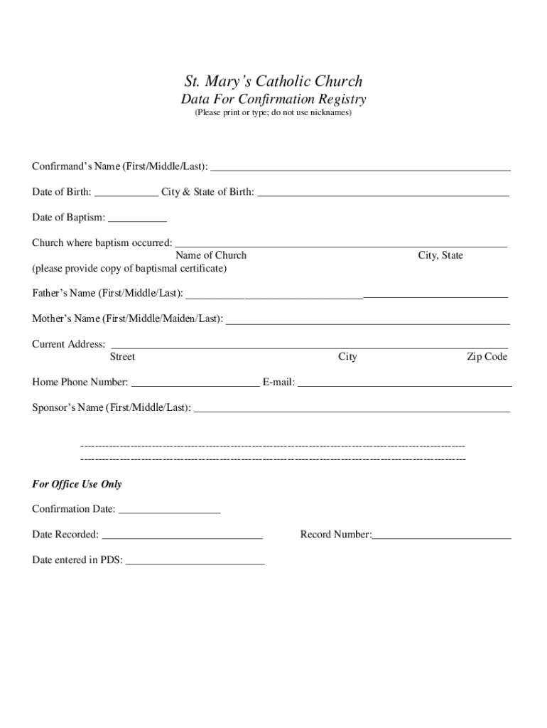 St. Mary's Catholic Church Data For Confirmation Registry (Please print or type; do not use nicknames)Confirmed Name (First/Middle/Last): ___ Date of Birth: ___ City & State of Birth: ___ Date of