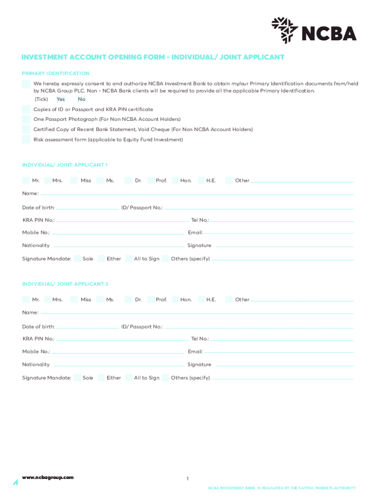 INVESTMENT ACCOUNT OPENING FORM INDIVIDUAL/ JOINT APPLICANT PRIMARY IDENTIFICATION We hereby expressly consent to and authorize NCAA Investment Bank to obtain my/our Primary Identification documents