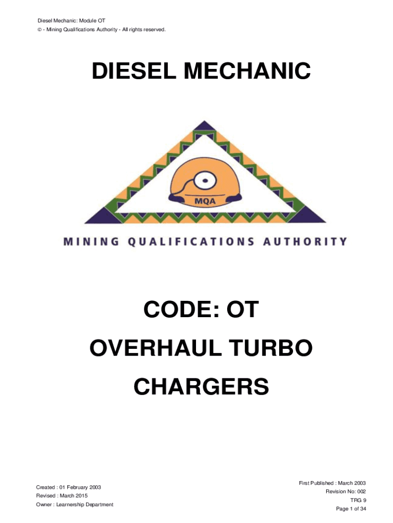 Diesel Mechanic: Module OT Mining Qualifications Authority All rights reserved. DIESEL MECHANICCODE: OT OVERHAUL TURBO CHARGERSCreated : 01 February 2003 Revised : March 2015 Owner : Learner ship