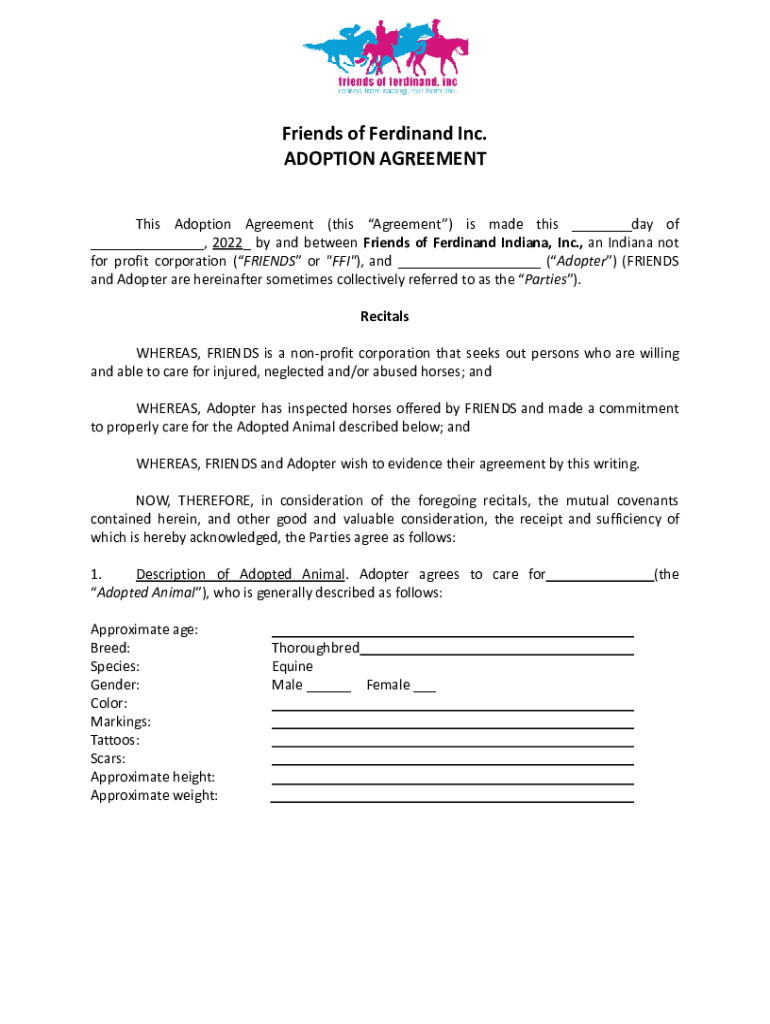 Friends of Ferdinand Inc. ADOPTION AGREEMENT This Adoption Agreement (this Agreement) is made this ___day of ___, 2022_ by and between Friends of Ferdinand Indiana, Inc., an Indiana not for profit