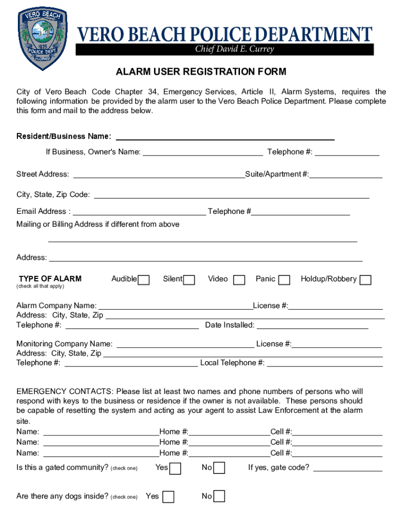 VERO BEACH POLICE DEPARTMENT Chief David E. Curry ALARM USER REGISTRATION FORM City of Vero Beach Code Chapter 34, Emergency Services, Article II, Alarm Systems, requires the following information
