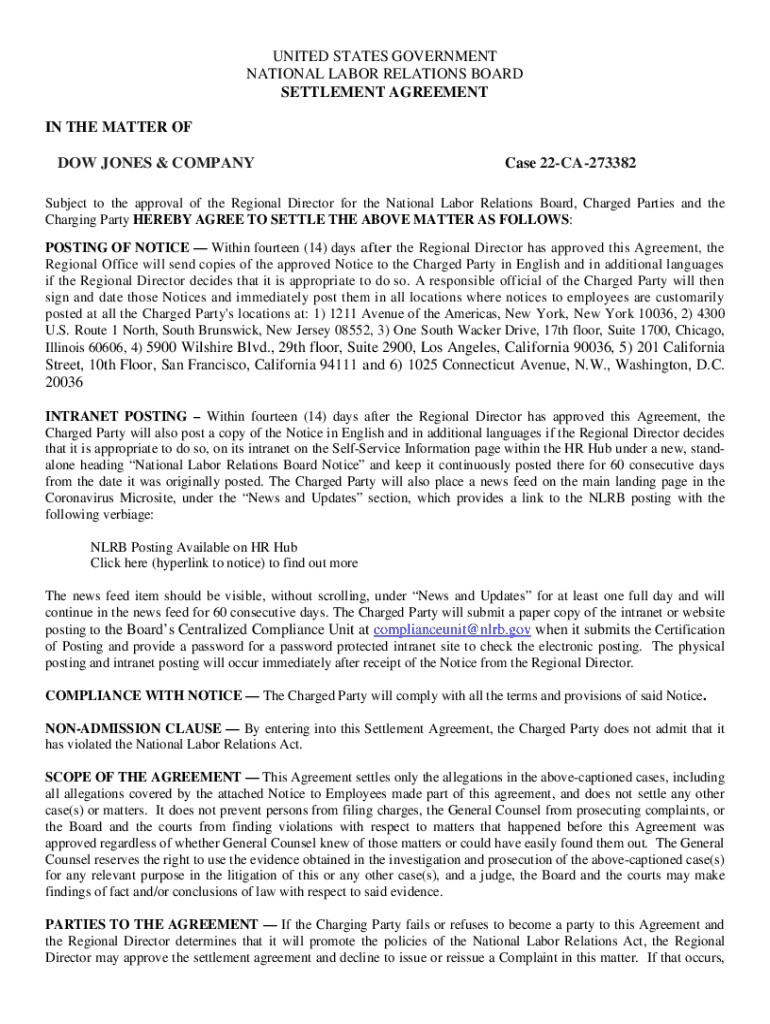 UNITED STATES GOVERNMENT NATIONAL LABOR RELATIONS BOARD SETTLEMENT AGREEMENT IN THE MATTER OF DOW JONES & COMPANY Case 22CA273382Subject to the approval of the Regional Director for the National Labor