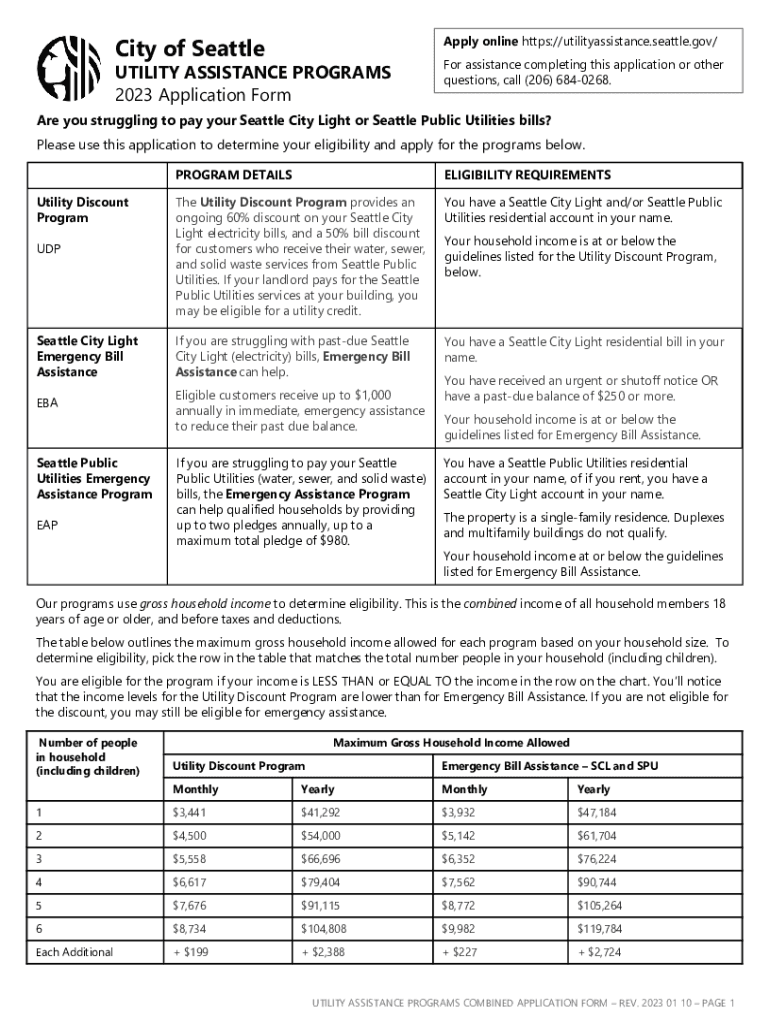 City of SeattleApply online https://utilityassistance.seattle.gov/UTILITY ASSISTANCE PROGRAMS 2023 Application Former assistance completing this application or other questions, call (206) 6840268.