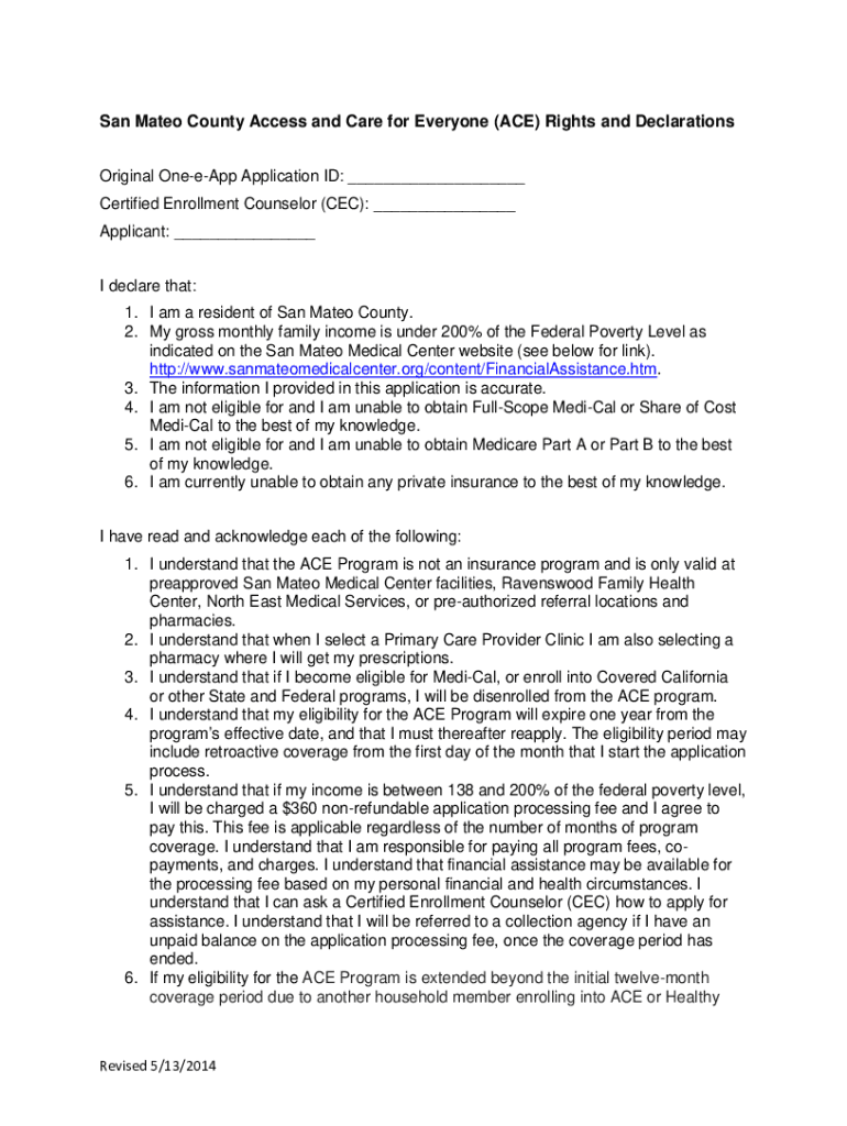 San Mateo County Access and Care for Everyone (ACE) Rights and Declarations Original Knapp Application ID: ___ Certified Enrollment Counselor (CEC): ___ Applicant: ___ I declare that: 1. I am a resident