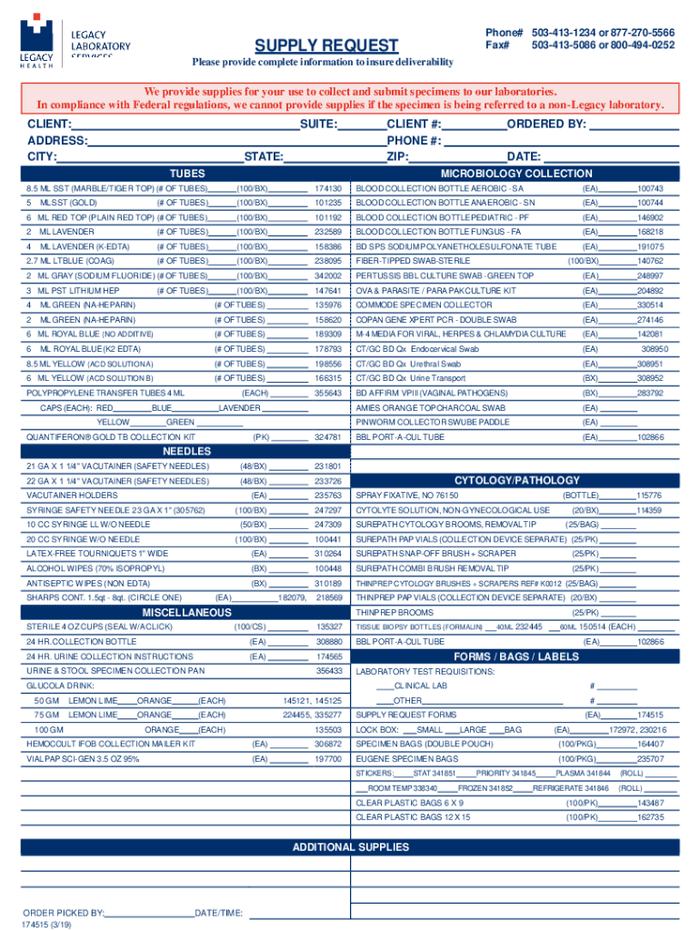 Phone# 5034131234 or 8772705566 Fax# 5034135086 or 8004940252SUPPLY REQUEST Please provide complete information to insure deliverability provide supplies for your used to collect and submit specimens