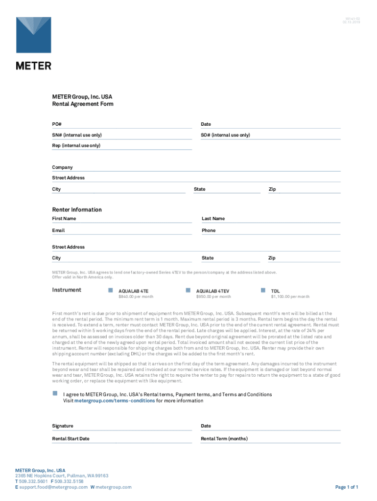 1814102 02.13.2019METER Group, Inc. USA Rental Agreement Form PO#Dates# (internal use only)SO# (internal use only)Rep (internal use only)Company Street Address CityStateZipRenter Information First