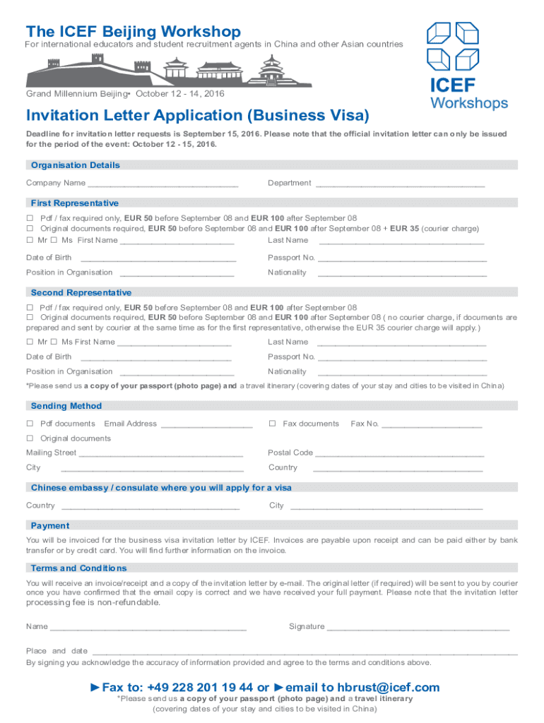 The ICE Beijing Workshop international educators and student recruitment agents in China and other Asian countriesGrand Millennium Beijing October 12 14, 2016Invitation Letter Application (Business