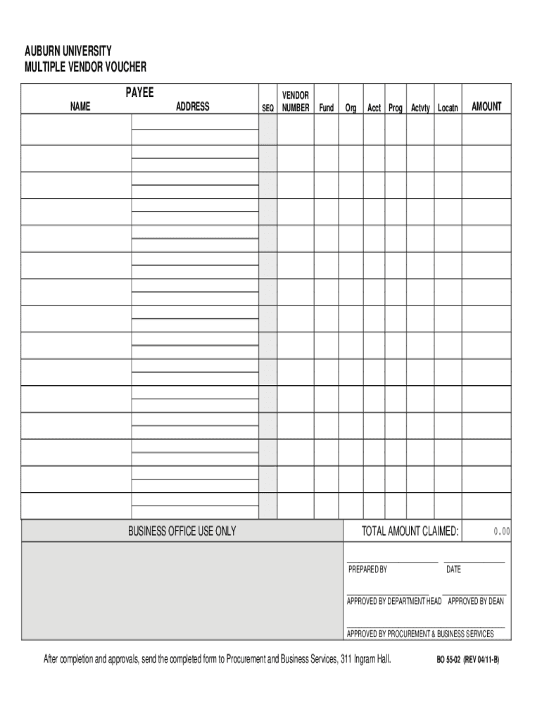 RESET FORMAUBURN UNIVERSITY MULTIPLE VENDOR VOUCHER PAYEE NAMEADDRESSSEQ//////////////////////////////BUSINESS OFFICE USE ONLYVENDOR NUMBERFundOrgAcctProgActvtyLocatnTOTAL AMOUNT CLAIMED: ___ PREPARED