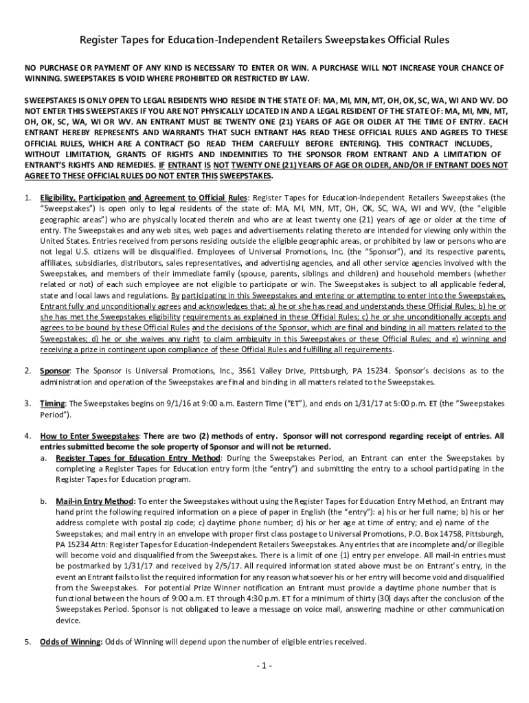 Register Tapes for EducationIndependent Retailers Sweepstakes Official Rules