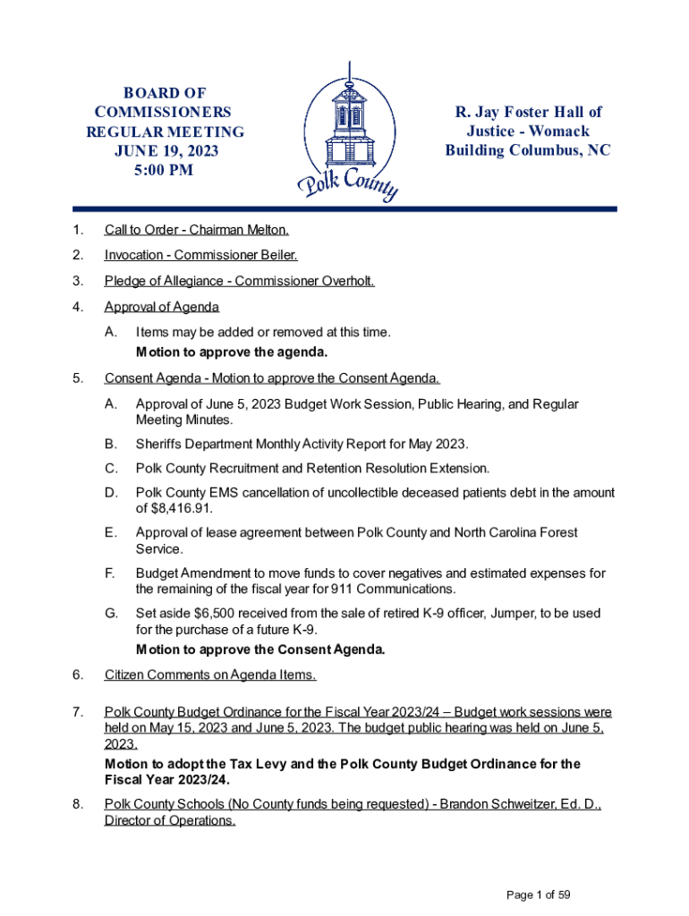B BOARD OF C COMMISSIONERS REGULAR MEETING JUNE 19, 2023 5:00 PM1. Call to Order Chairman Melton.2. Invocation Commissioner Baler.3. Pledge of Allegiance Commissioner Overcoat.4. Approval of Agenda