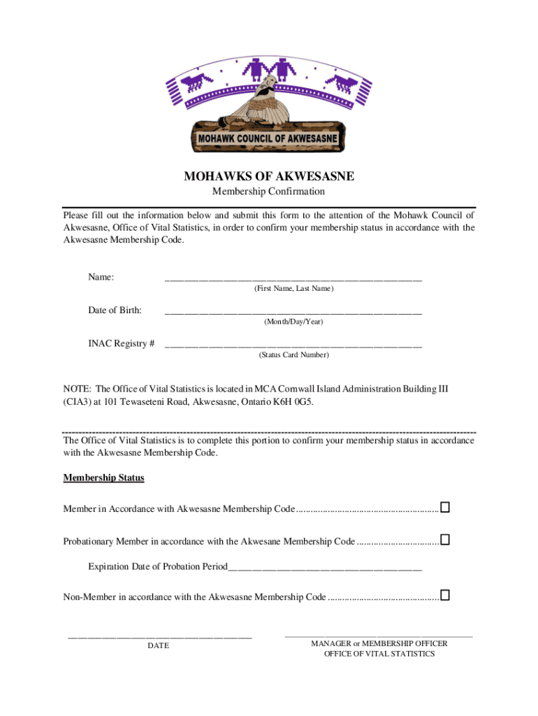 MOHAWKS OF AKWESASNE Membership Confirmation Please fill out the information below and submit this form to the attention of the Mohawk Council of Aquitaine, Office of Vital Statistics, in order to