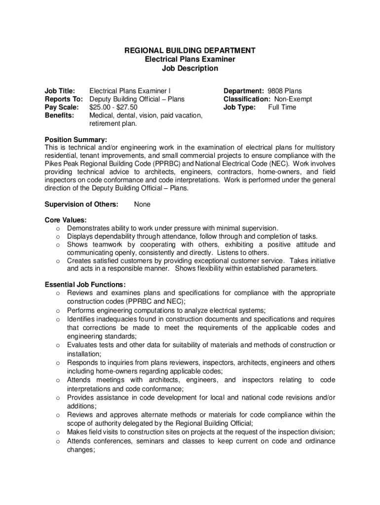 REGIONAL BUILDING DEPARTMENT Electrical Plans Examiner Job Description Job Title: Reports To: Pay Scale: Benefits:Electrical Plans Examiner I Deputy Building Official Plans $$25.0027.50 Medical, dental,