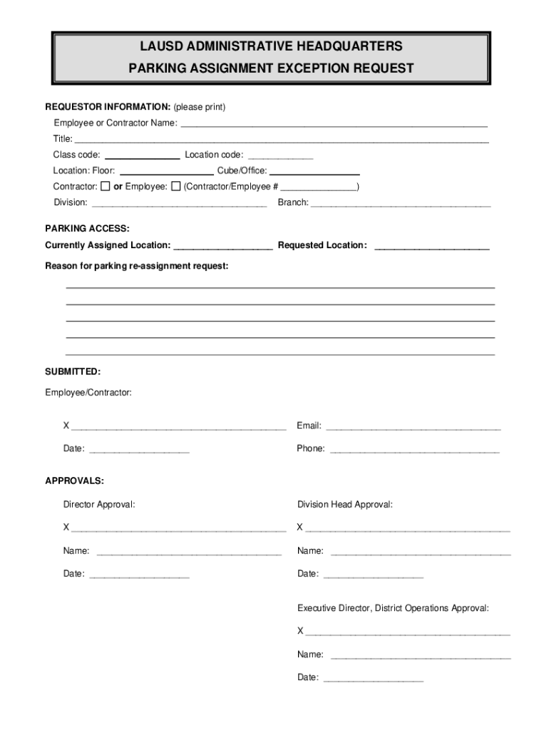 LAUD ADMINISTRATIVE HEADQUARTERS PARKING ASSIGNMENT EXCEPTION REQUEST REQUESTOR INFORMATION: (please print) Employee or Contractor Name:___Title: ___ Class code: ___ Location code: ___ Location: Floor: