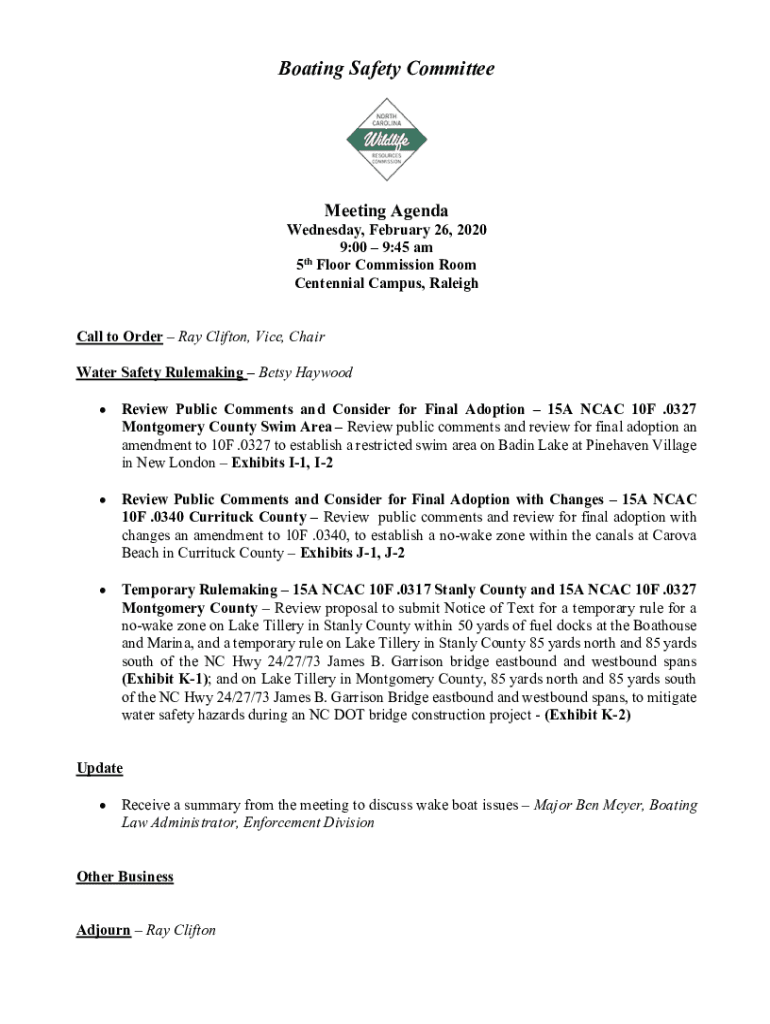 Boating Safety CommitteeMeeting Agenda Wednesday, February 26, 2020 9:00 9:45 am TH 5 Floor Commission Room Centennial Campus, Raleigh Call to Order Ray Clifton, Vice, Chair Water Safety Rule making