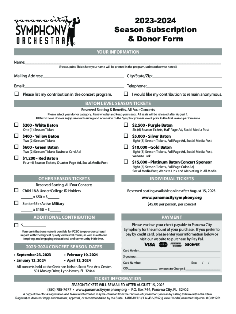 20232024 Season Subscription & Donor Form YOUR INFORMATION Name:(Please, print. This is how your name will be printed in the program, unless otherwise noted.) Mailing Address:City/State/Zip:Email:Telephone:Please