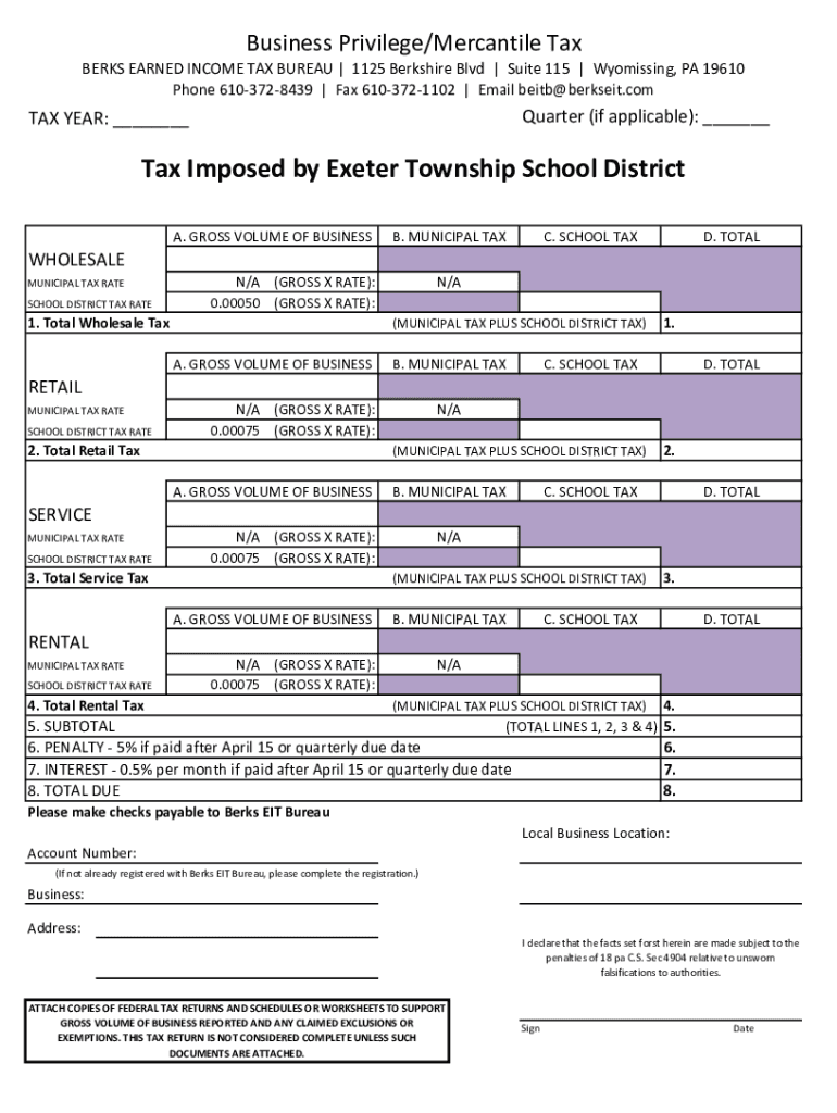 Business Privilege/Mercantile Tax BERKS EARNED INCOME TAX BUREAU | 1125 Berkshire Blvd | Suite 115 | Wyo missing, PA 19610 Phone 6103728439 | Fax 6103721102 | Email beitb@berkseit.comQuarter (if applicable):