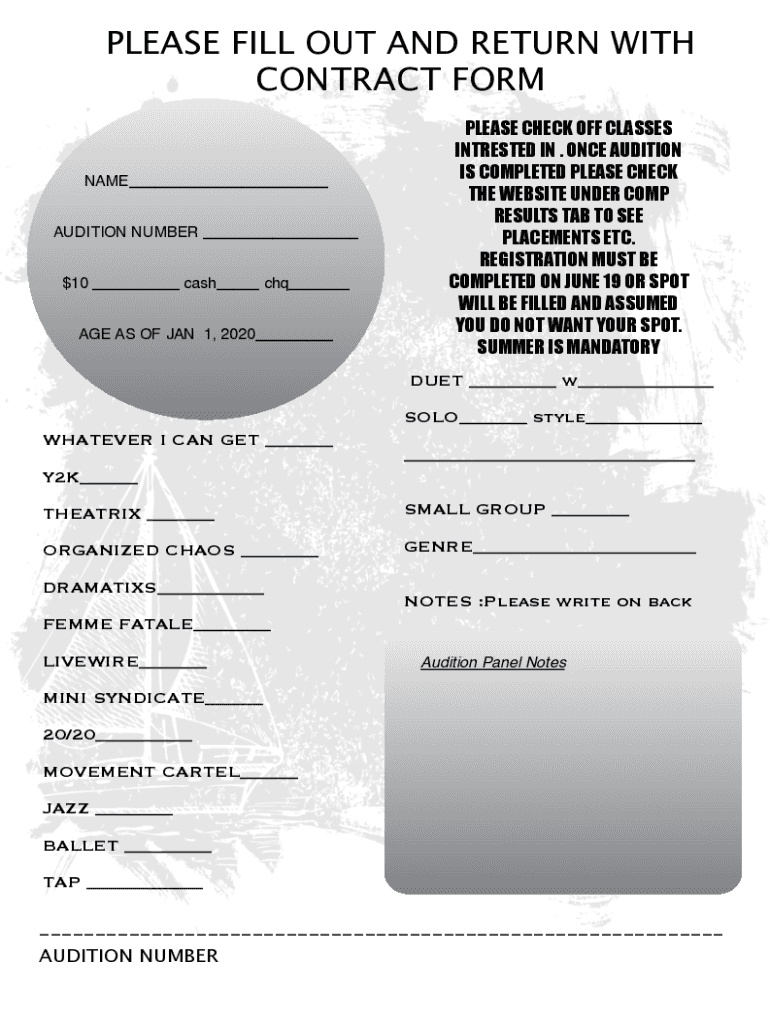 PLEASE FILL OUT AND RETURN WITH CONTRACT FORM NAME___ AUDITION NUMBER ___ $10 ___ cash___ CHQ___ AGE AS OF JAN 1, 2020___PLEASE CHECK OFF CLASSES INTERESTED IN. ONCE AUDITION IS COMPLETED PLEASE CHECK