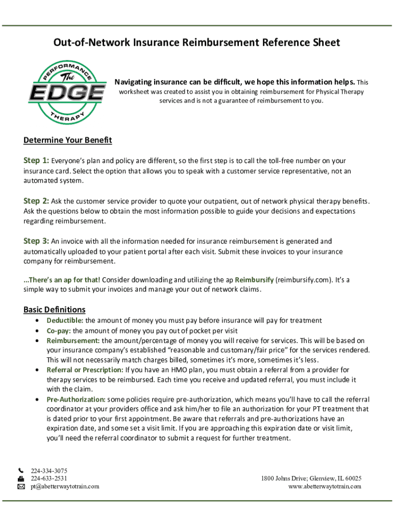 OutofNetwork Insurance Reimbursement Reference Sheet Navigating insurance can be difficult, we hope this information helps. This worksheet was created to assist you in obtaining reimbursement for