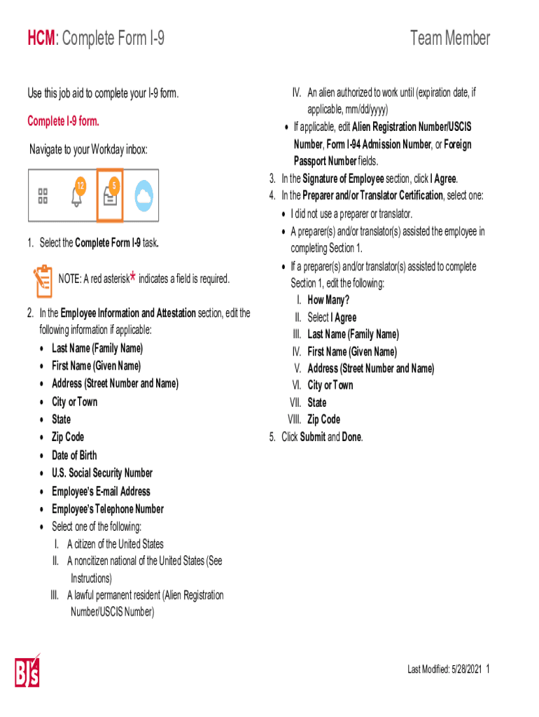 HIM: Complete Form I9 Use this job aid to complete your I9 form. Complete I9 form. Navigate to your Workday inbox:1. Select the Complete Form I9 task. NOTE: A red asterisk indicates a field is required.2.