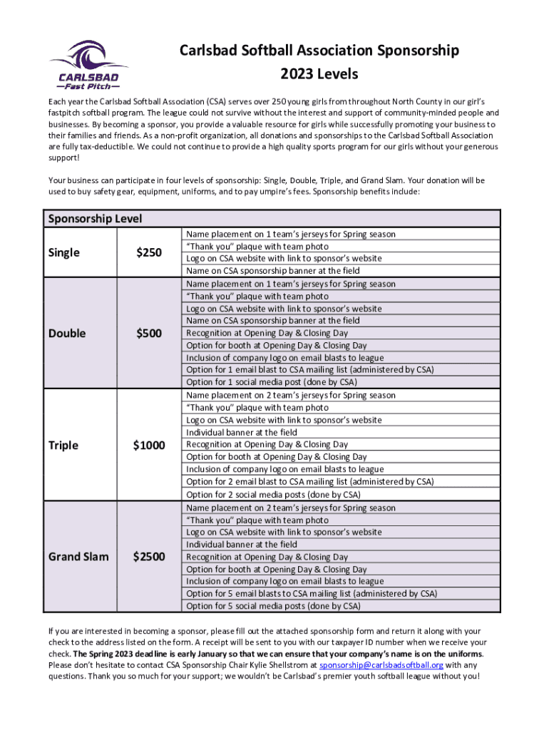 CarlsbadSoftballAssociationSponsorship 2023Levels EachyeartheCarlsbadSoftballAssociation(CSA)servesover250younggirlsfromthroughoutNorthCountyinourgirls fastpitchsoftballprogram. Theleaguecouldnotsurvivewithouttheinterestandsupportofcommunitymindedpeopleand