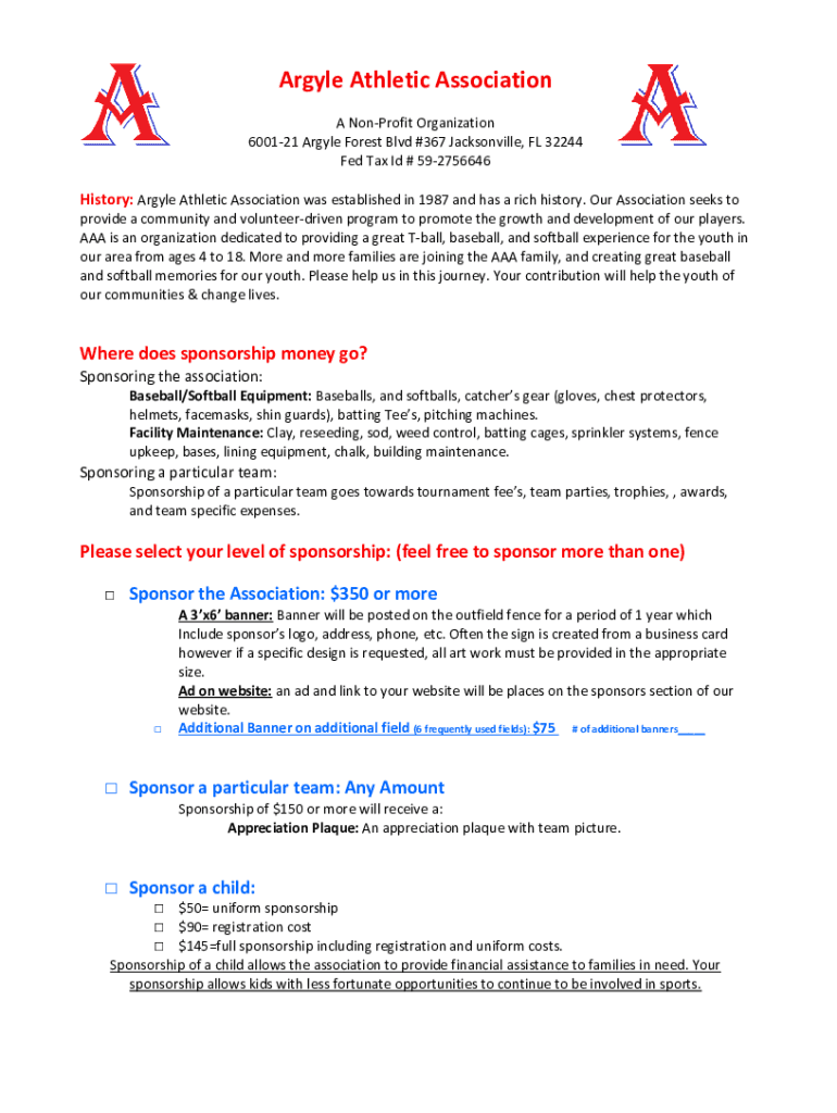Argyle Athletic Association A Nonprofit Organization 600121 Argyle Forest Blvd #367 Jacksonville, FL 32244 Fed Tax I'd # 592756646History: Argyle Athletic Association was established in 1987 and has