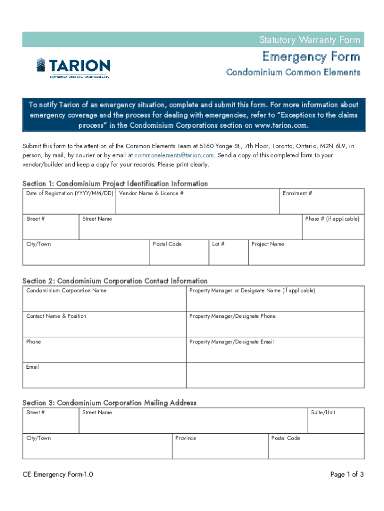 Statutory Warranty FormEmergency Form Condominium Common Elements T o notify T Marion of an emergency situation, complete and submit this form. For more information about emergency coverage and the