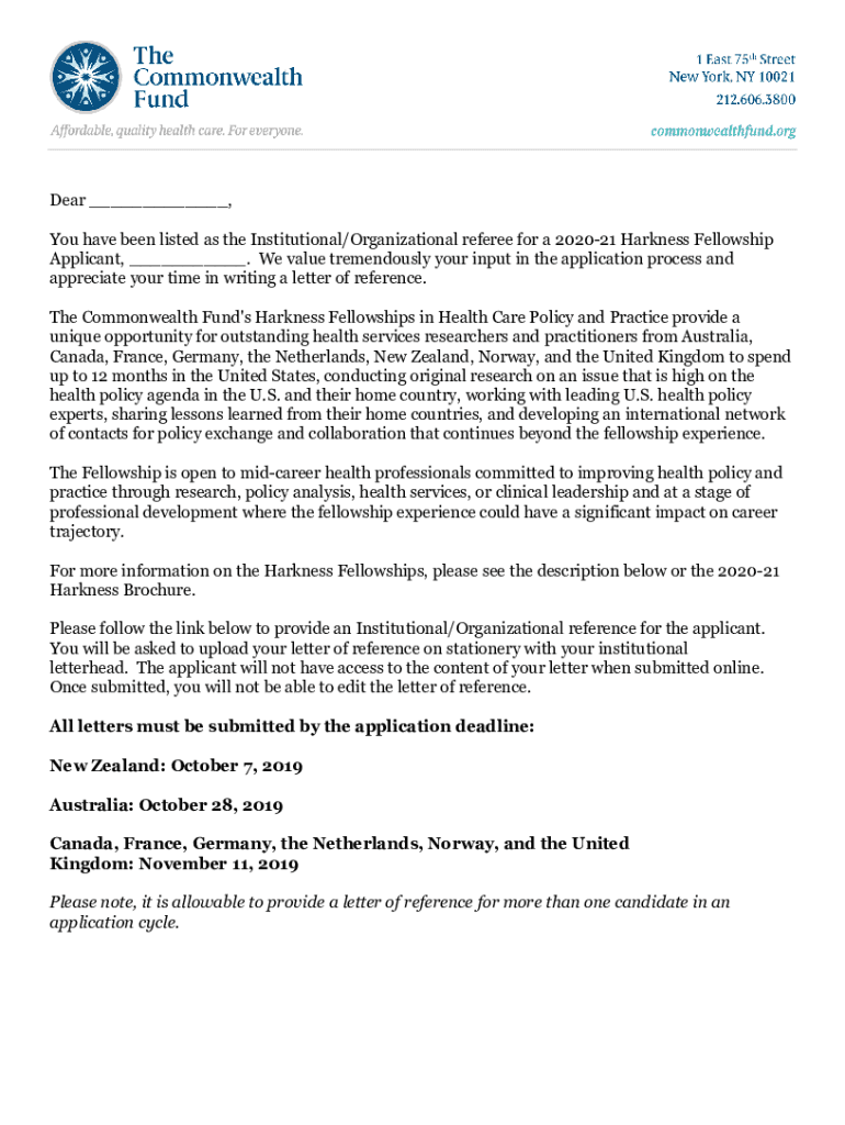 Dear ___, You have been listed as the Institutional/Organizational referee for a 202021 Harkness Fellowship Applicant, ___. We value tremendously your input in the application process and appreciate