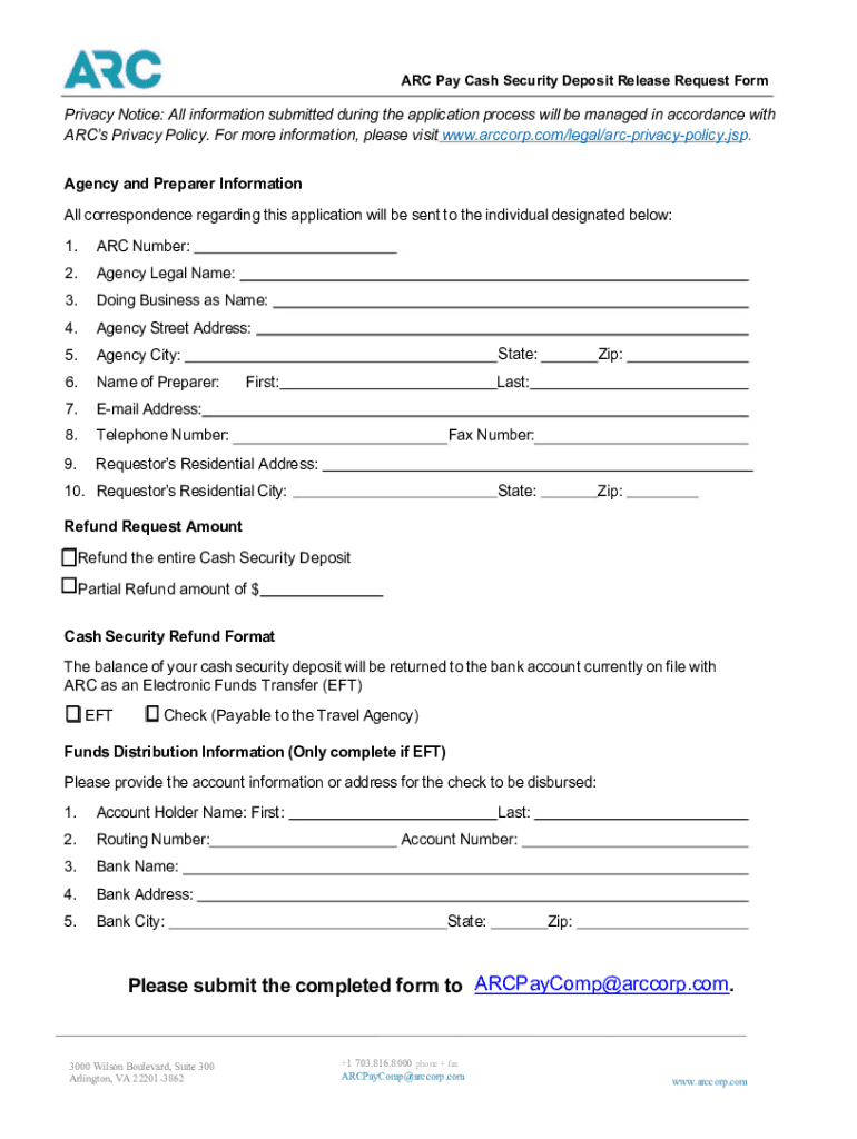 A7CARC Pay Cash Security Deposit Release Request FormPrivacy Notice: All information submitted during the application process will be managed in accordance with ARC's Privacy Policy. For more information,