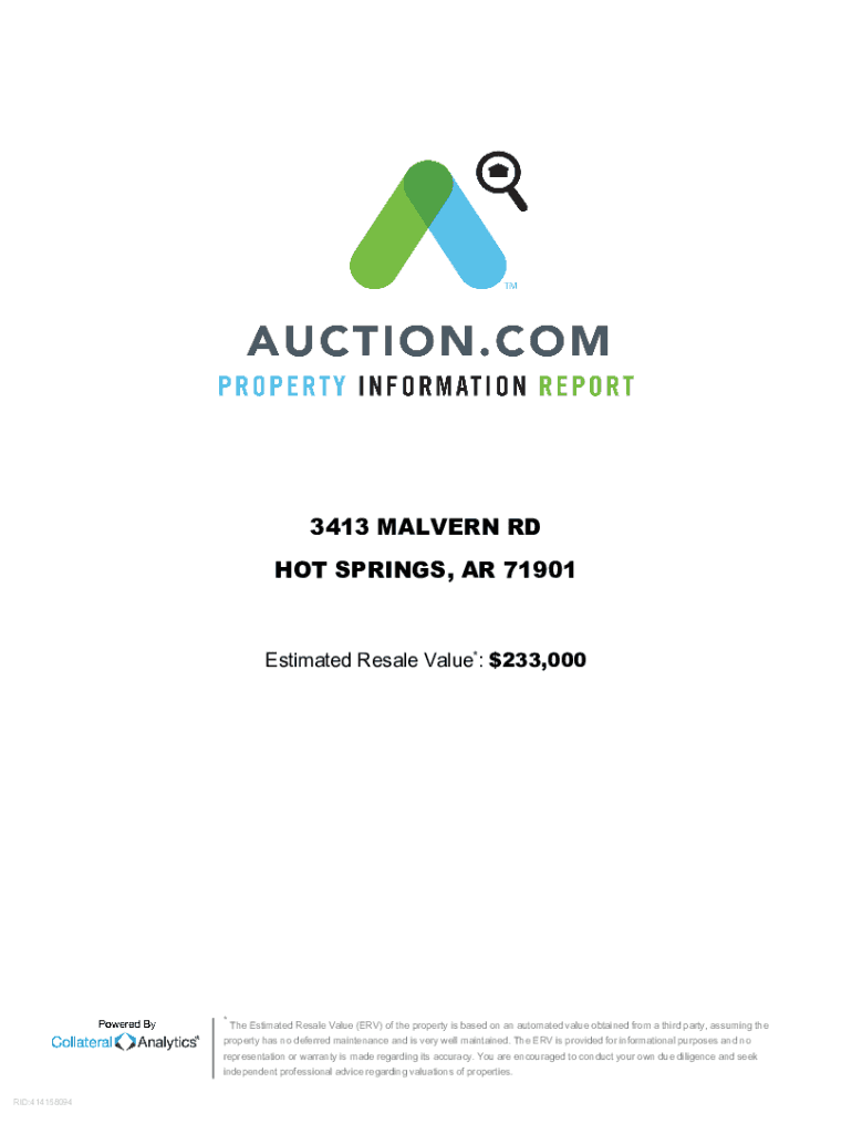 3413 TAVERN RD HOT SPRINGS, AR 71901Estimated Resale Value*: $233,000×The Estimated Resale Value (ERV) of the property is based on an automated value obtained from a third party, assuming the property