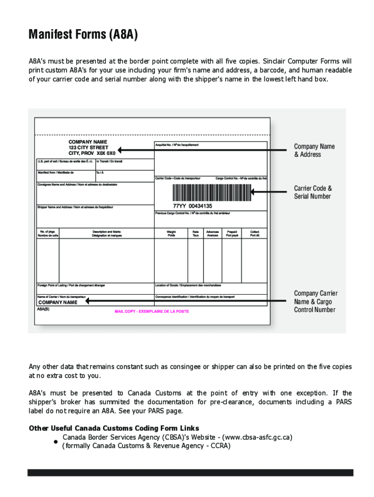 Manifest Forms (A8A) A8A\'s must be presented at the border point complete with all five copies. Sinclair Computer Forms will print custom A8A\'s for your use including your firm\'s name and address,