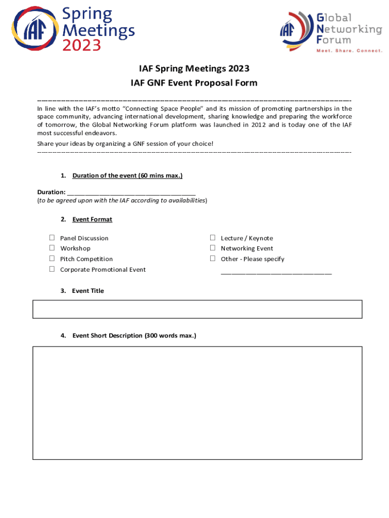 IAF Spring Meetings 2023 IAF GNF Event Proposal Form In line with the IAS motto Connecting Space People and its mission of promoting partnerships in the space community, advancing international development,