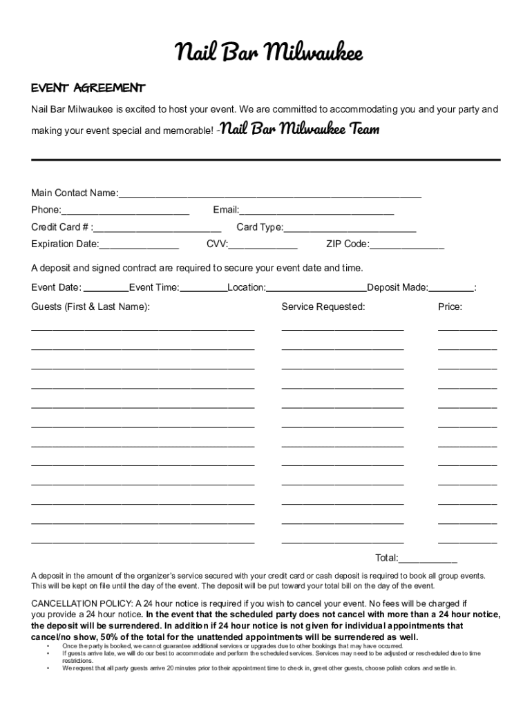 Nail Bar Milwaukee EVENT AGREEMENT Nail Bar Milwaukee is excited to host your event. We are committed to accommodating you and your party and making your event special and memorable! Mailbag Milwaukee