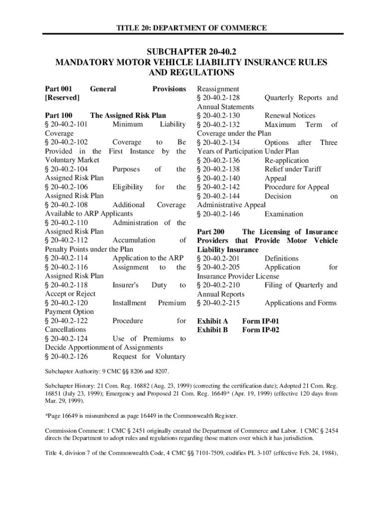 TITLE 20: DEPARTMENT OF COMMERCESUBCHAPTER 2040.2 MANDATORY MOTOR VEHICLE LIABILITY INSURANCE RULES AND REGULATIONS Part 001 [Reserved]GeneralProvisionsPart 100 The Assigned Risk Plan \' 2040.2101