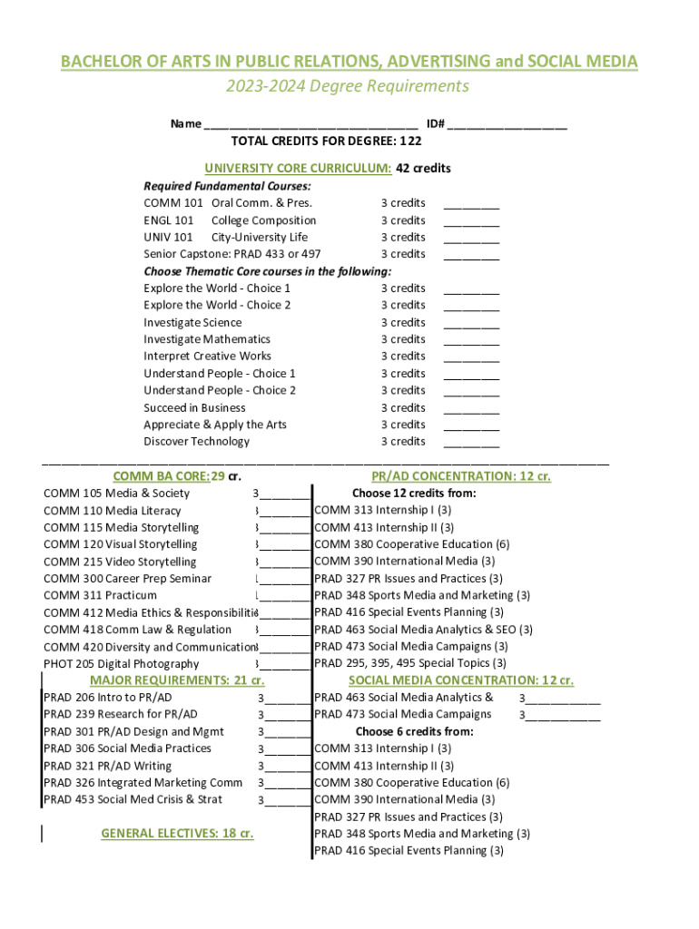 BACHELOR OF ARTS IN PUBLIC RELATIONS, ADVERTISING and SOCIAL MEDIA 20232024 Degree Requirements Name ___ ID# ___TOTAL CREDITS FOR DEGREE: 122UNIVERSITY CORE CURRICULUM: 42 creditsRequired Fundamental